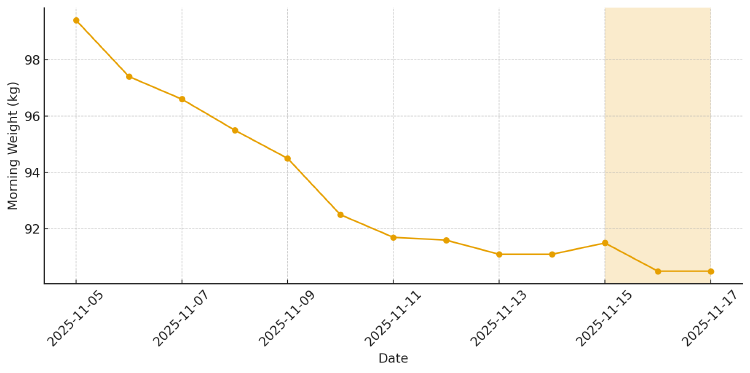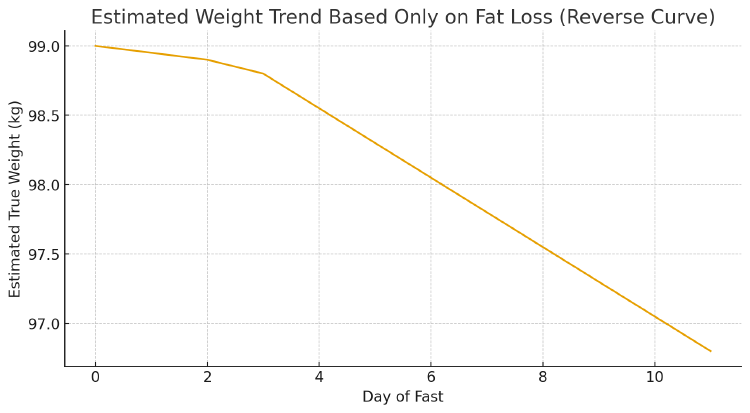 But what I actually saw was different. Weight dropped fast initially, which was largely "water + glycogen + gut contents.", and then sort of plateaued. This is water weight since I was trying to drink around 3L of water a day.